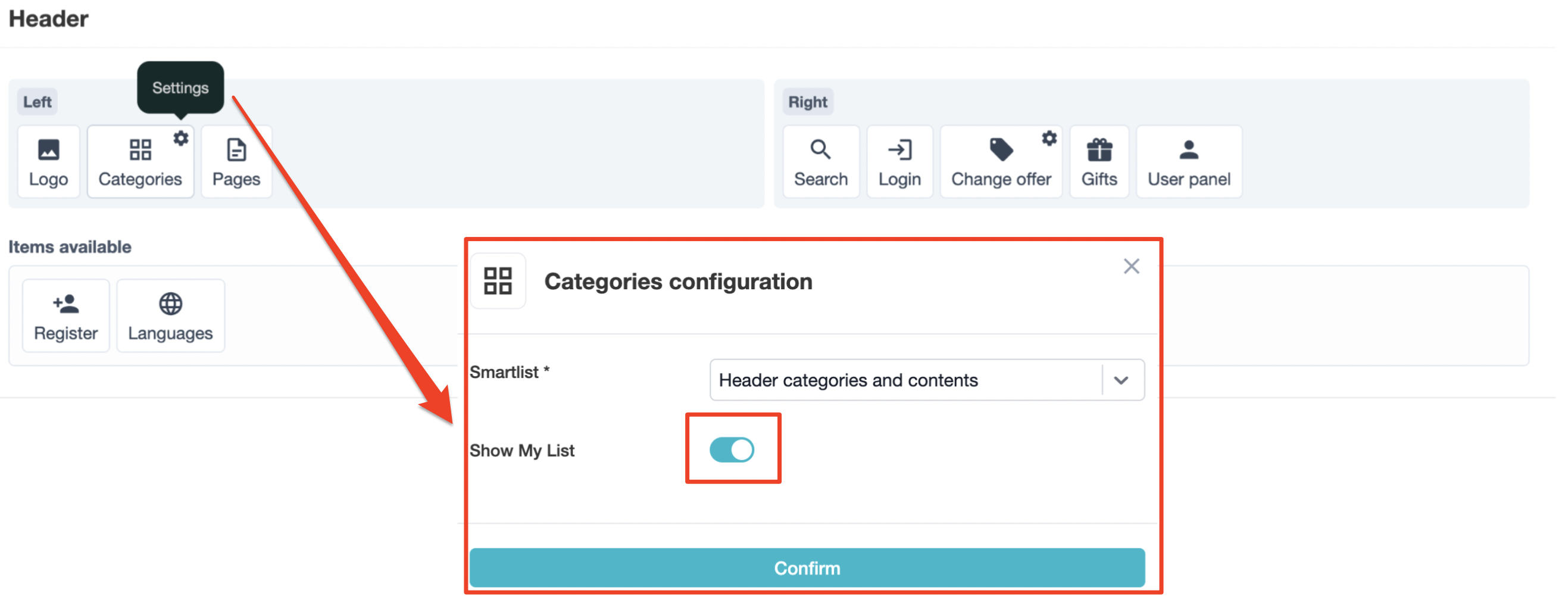 For do the final activation of the “My list” feature”, you need to activate it on the layout of your plaform in your back office menu Header & Footer > Header > Categories > My List