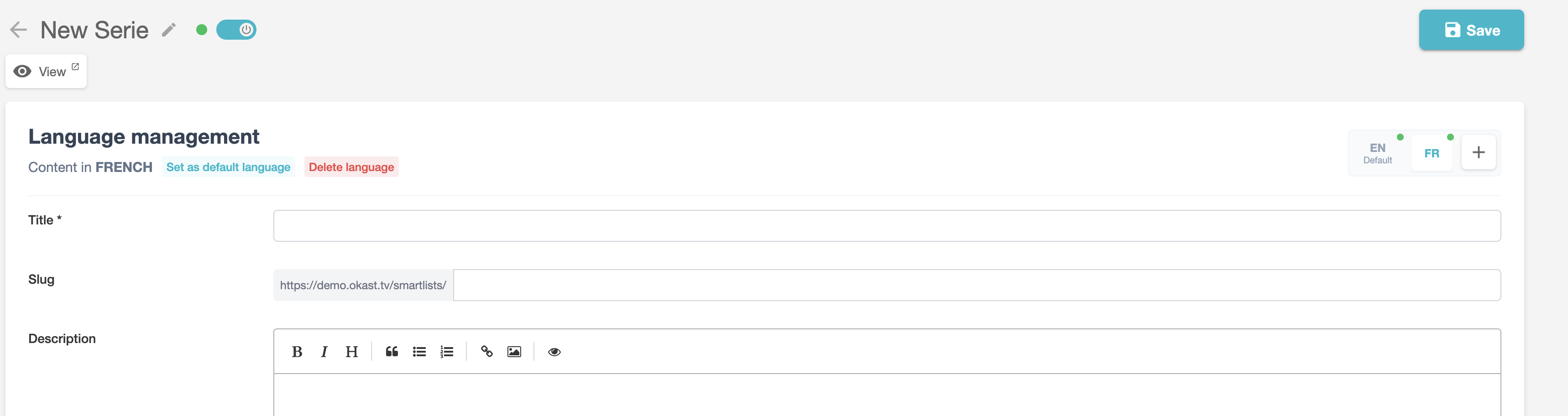 The checked language is the default language for your series. This is the language in which your series will appear by default if no translation exists in your users' browser language.
