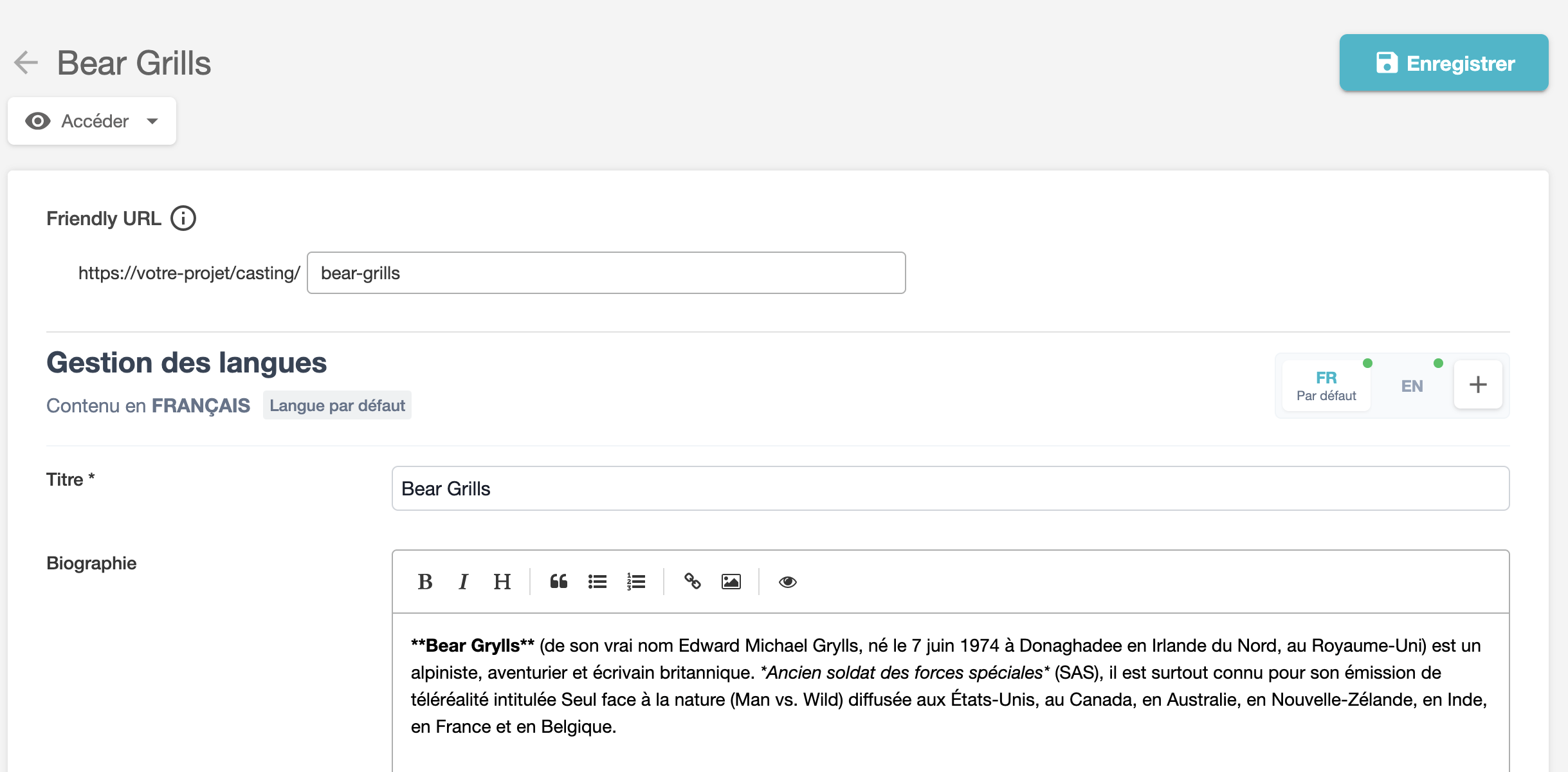 Comme pour chaque page de votre plateforme, les pages casting peuvent être traduites en plusieurs langues avec le module Gestion des langues.